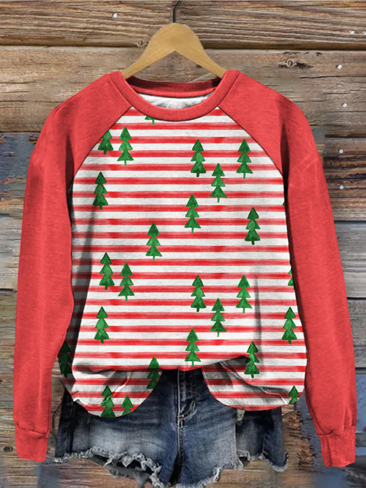 Watercolor Christmas Trees on Stripes Comfy Sweatshirt