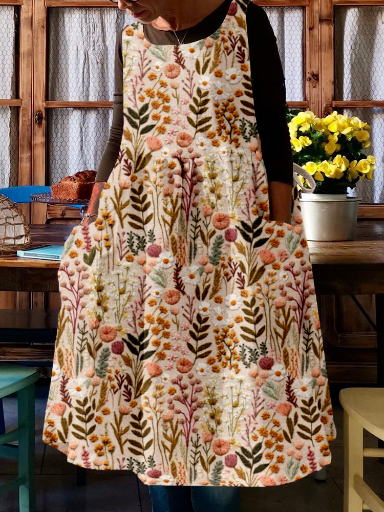 • Wildflower Meadow Floral Embroidery Art Comfy Midi Pinafore Dress