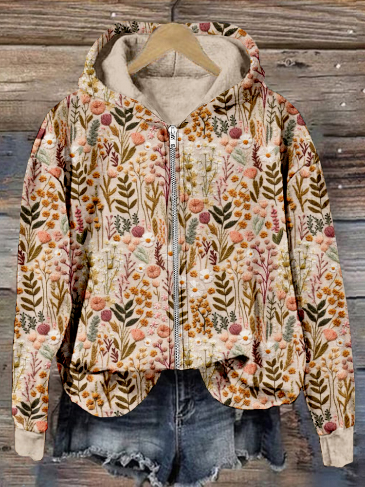 Wildflower Meadow Floral Embroidery Art Comfy Zip Up Hoodie