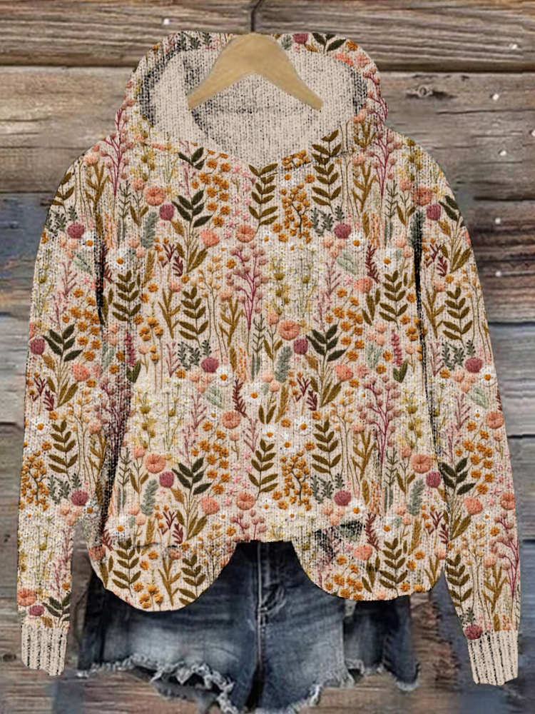 • Wildflower Meadow Floral Embroidery Art Cozy Knit Hoodie