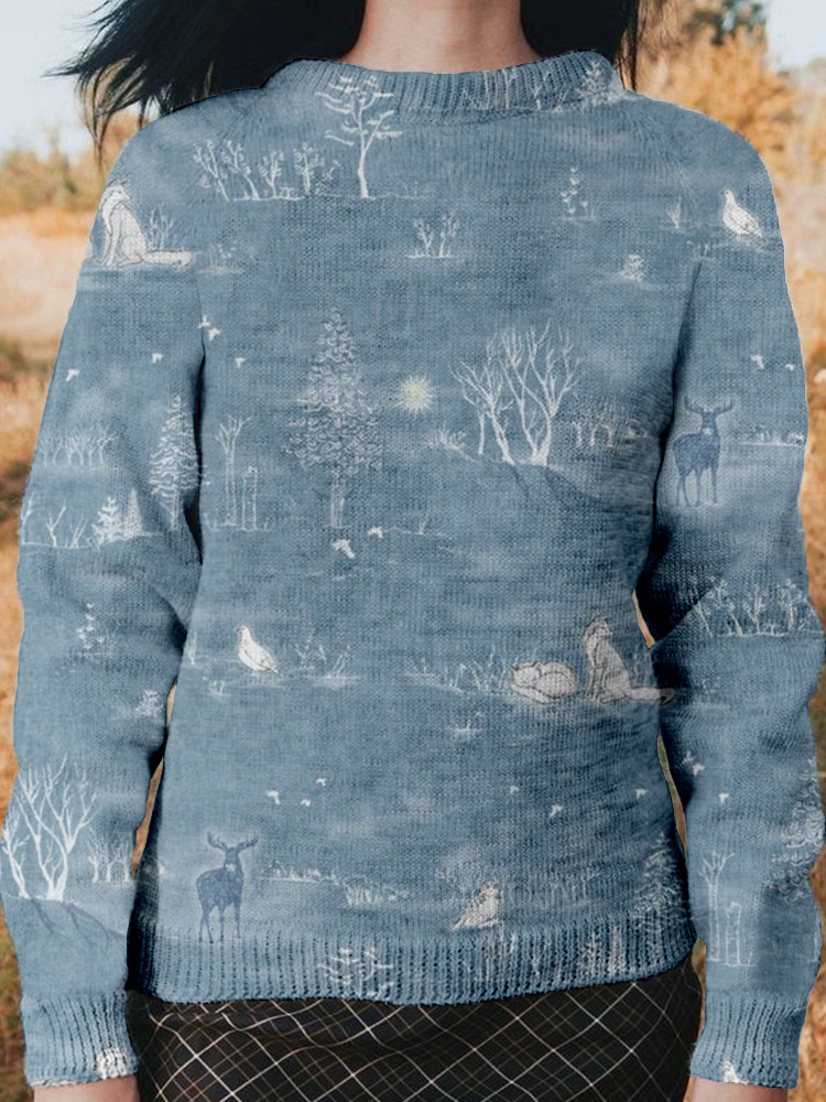 Winter Forest Toile Crew Neck Comfy Knit Sweater