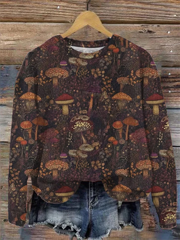 Women's Vintage Mushroom Print Round Neck Sweatshirt